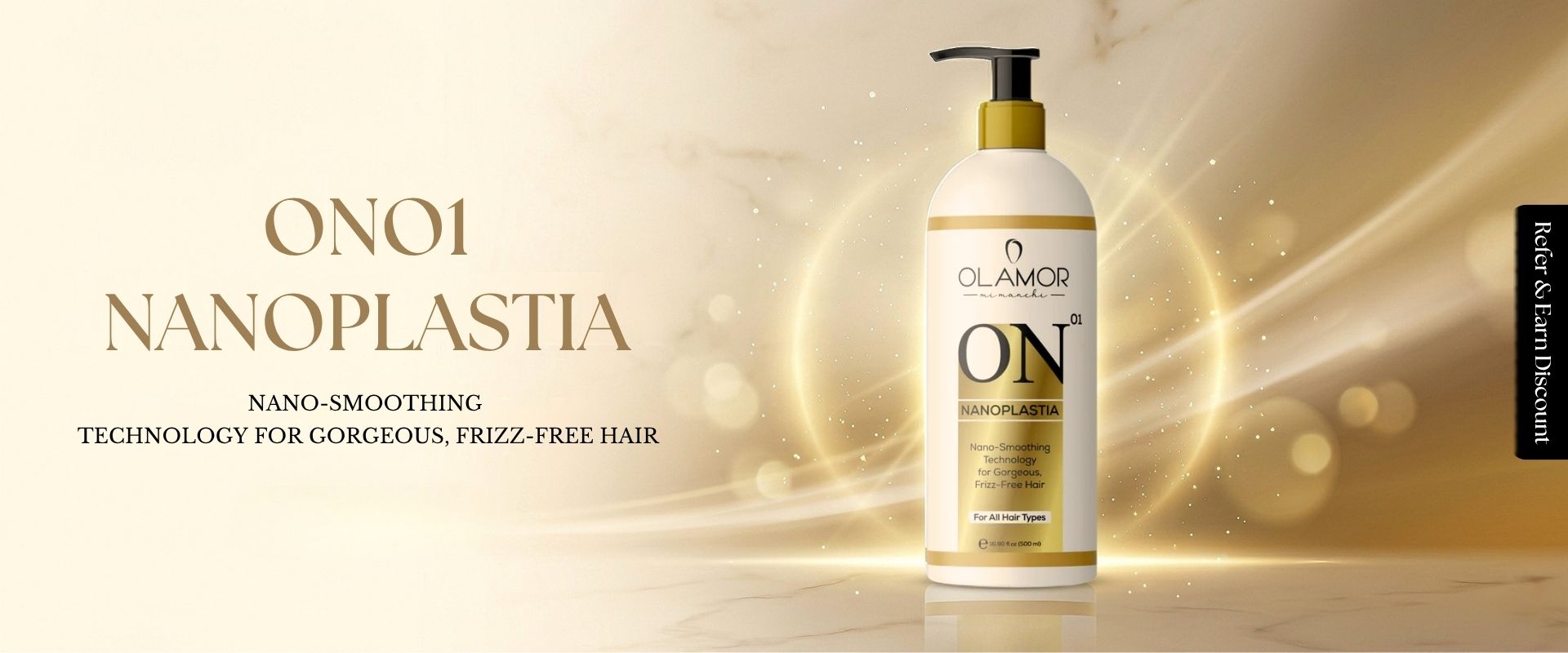 OLAMOR ON 01 Nanoplastia Hair Treatment is a professional smoothing and restructuring system designed to reduce frizz, improve manageability, and enhance shine. Powered with advanced conditioning agents and nourishing coconut oil, it works by aligning hair fibers and delivering long-lasting smoothness while maintaining softness and movement.