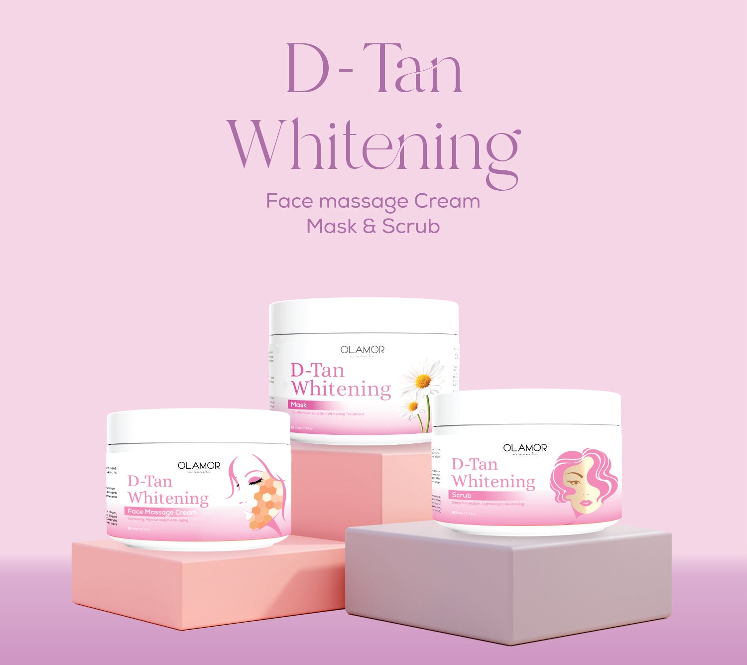 The D-tan whitening series consists of a mask, scrub, and face massage cream that work together to brighten and even out skin tone while reducing the appearance of dark spots and discoloration. Use this series regularly to achieve a radiant and rejuvenated complexion.