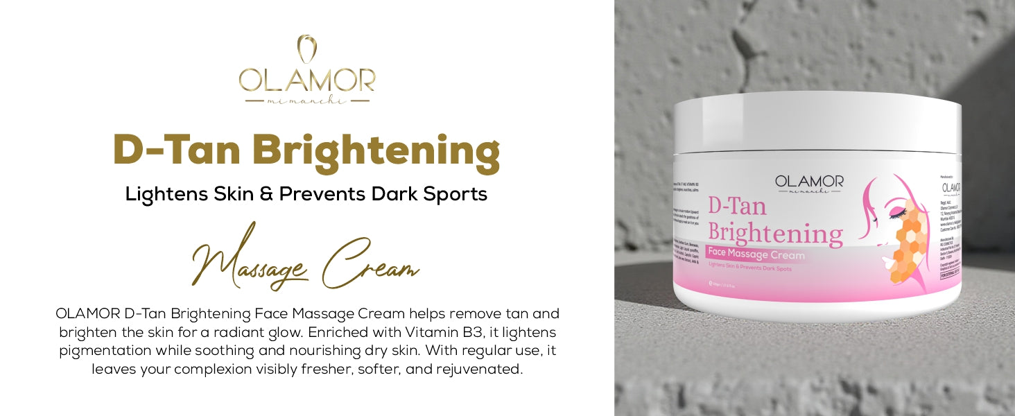OLAMOR DE-TAN FACE Massage Cream will remove all tan. it has VITAMIN B3 properties. cream will be soothing your skin. it brightens, nourishes, calms Whitens, and lightens pigmentation . D-Tan Brightening Face Massage Cream 500GM removes tan, brightens dull skin, and deeply nourishes for a smooth, radiant, and even-toned glow.