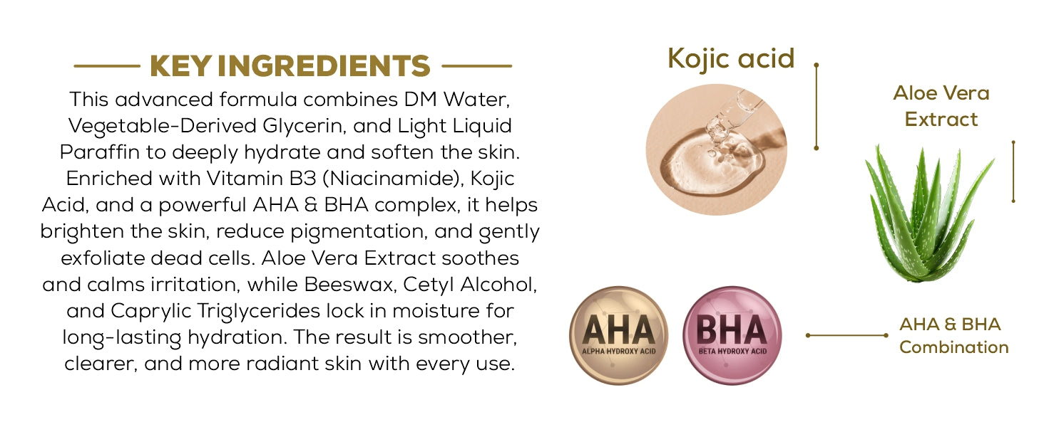 DM Water, Glycerin (Vegetable Derived), Triethylamine, Xanthan Gum, Beeswax, Cetyl Alcohol, Ceto - Stearyl, Glycerol monostearate, Light Liquid paraffin, Emulsifying Wax, Titanium Dioxide, stearic acid, Cetyl alcohol, Caprylic Capric Triglycerides, vitamin B3 niacinamide, phenoxyethanol, aloe vera Extract, kojic acid, AHA & BHA combination., FRAGRANCE.