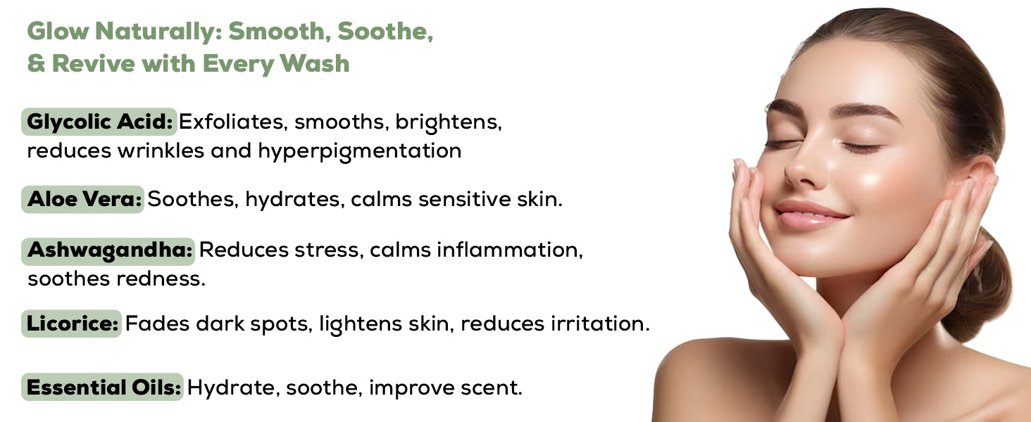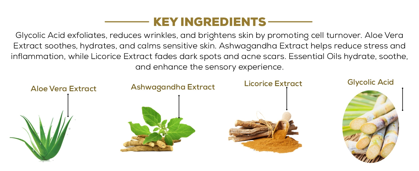 Aqua, Glycerin, Glycolic Acid, Aloe Vera (aloe barbadensis) Extract, Lauryl Glusoside, Cocoyl Glucoside, Sodium Lauryl Sarcosinate, Coco Amidi Propyl Beatine, Ashwagandha(Withania Somnifera) Extract, Licorice (Glycyrrhiza glabra Linné) Extract, Sodium Gluconate, Ethylexylglycerin And Phenoxyenthanol, Essential Oils.