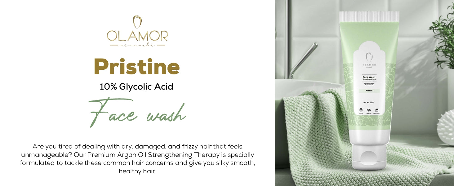 OLAMOR: Glacial Wash with Glycolic Acid Pristine Face Wash offers a premium skincare experience. This advanced formula is expertly crafted to exfoliate and cleanse, removing dead skin cells, excess oil, and impurities that contribute to a dull complexion. With 10% glycolic acid, it enhances skin texture, minimizes pores, and helps prevent breakouts.