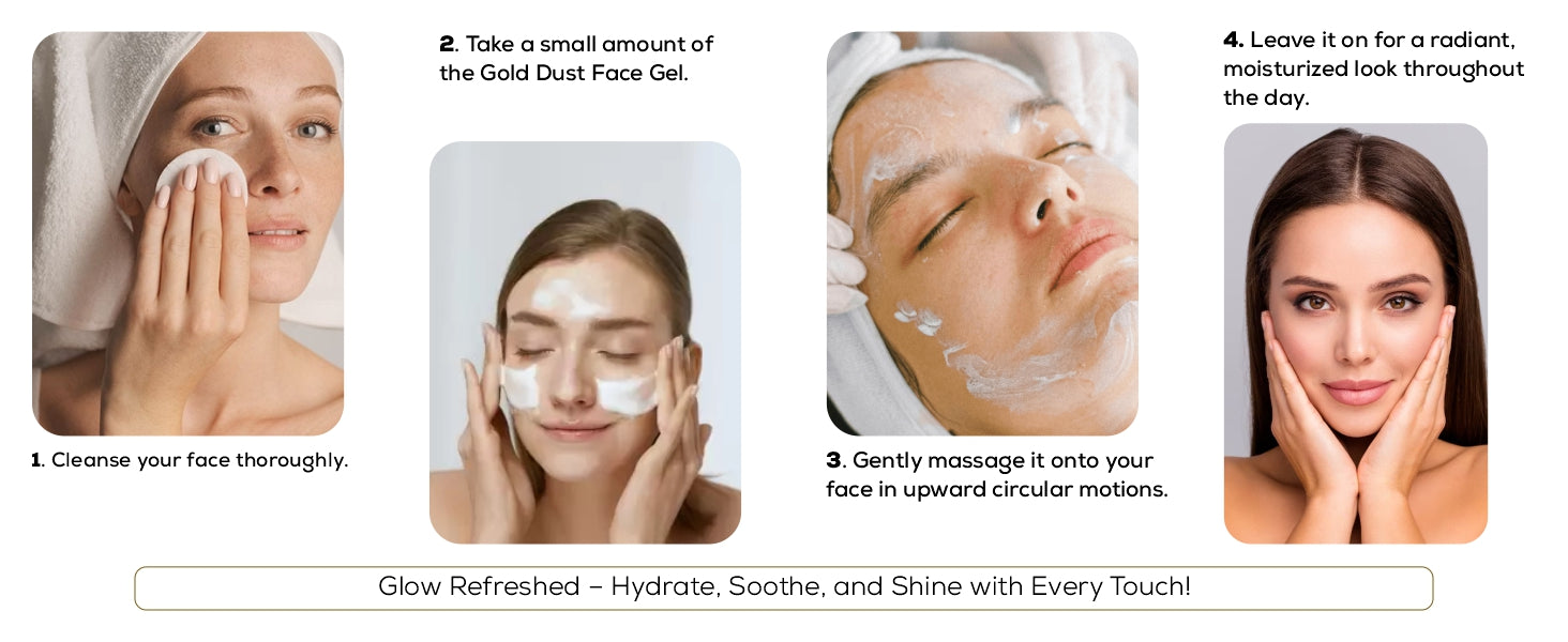 Whether you're battling dry patches, tired-looking skin, or simply need a boost of freshness, the Gold Dust Face Gel offers the perfect solution. Its gentle formulation makes it safe for daily use, and with every application, you’ll notice your skin feeling cooler, smoother, and brighter.