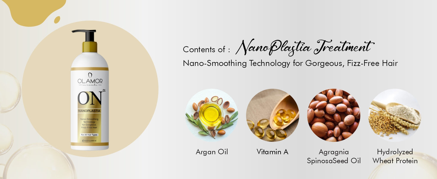 OLAMOR ON 01 Nanoplastia Hair Treatment is a professional smoothing and restructuring system designed to reduce frizz, improve manageability, and enhance shine. Powered with advanced conditioning agents and nourishing coconut oil, it works by aligning hair fibers and delivering long-lasting smoothness while maintaining softness and movement.